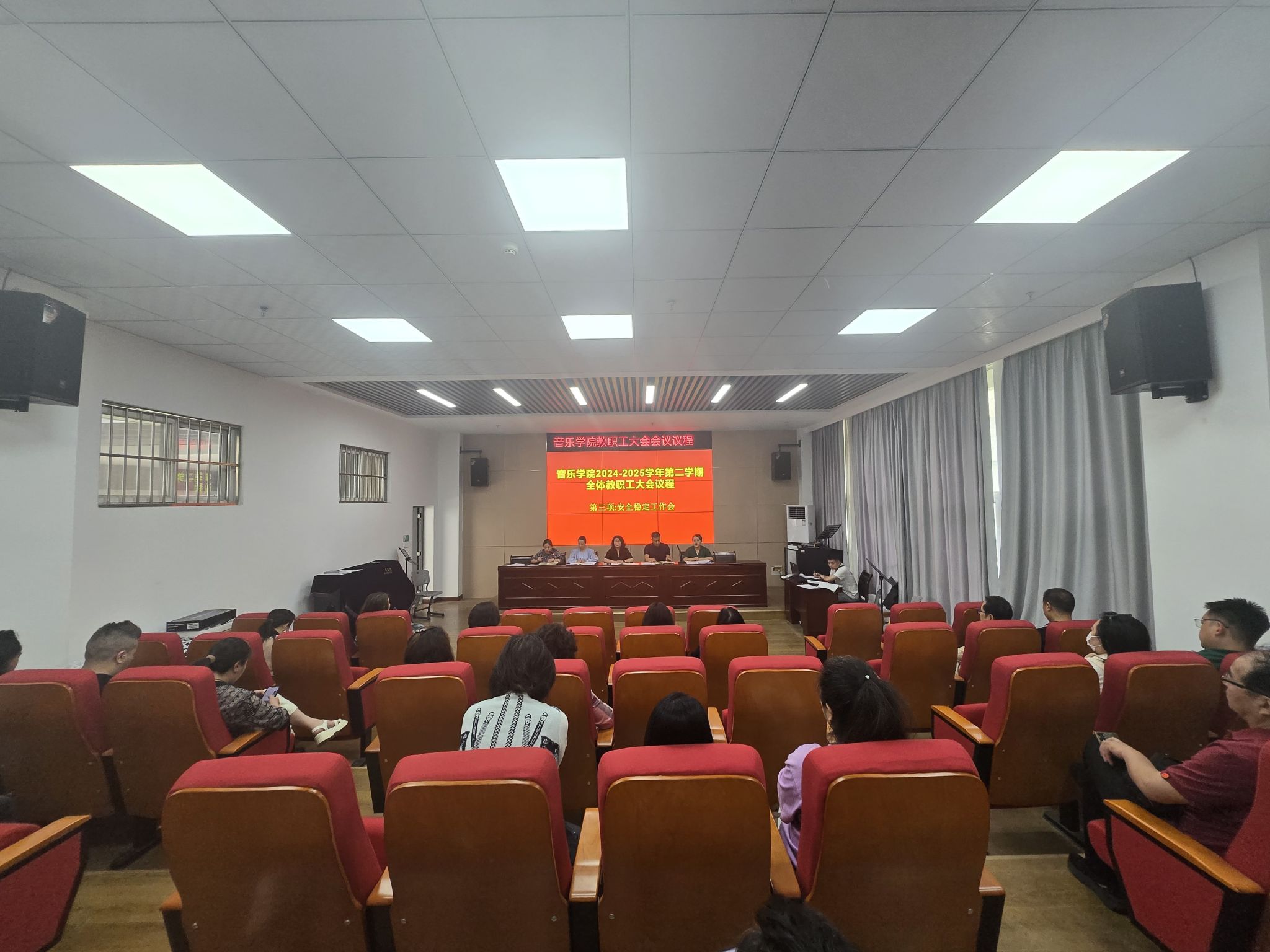 5 月 14 日,音乐学院在明德楼 C0103 报告厅召开2024-2025 学年第二学期全体教职工大会,会议由党总支书记薛斌主持。 会上,副院长郭瑞玺通报专业评估工作启动情况,围绕四个阶段性任务明确时间节点与重点内容,强调...