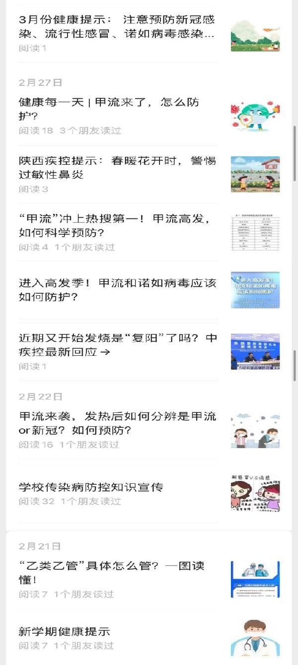 通过院微信公众号“团小音”推送病毒性腮腺炎、诺如病毒、甲流等常见传染病的特征、传播途径、预防措施等方面的知识,为广大师生的健康保驾护航。