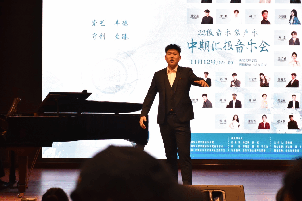 音乐会涵盖美声与民族两种演唱方向,曲目类型丰富,包括古诗词艺术歌曲、创作歌曲、歌剧选段及外文声乐作品,全面检验了学生的声乐技巧与音乐表现力。