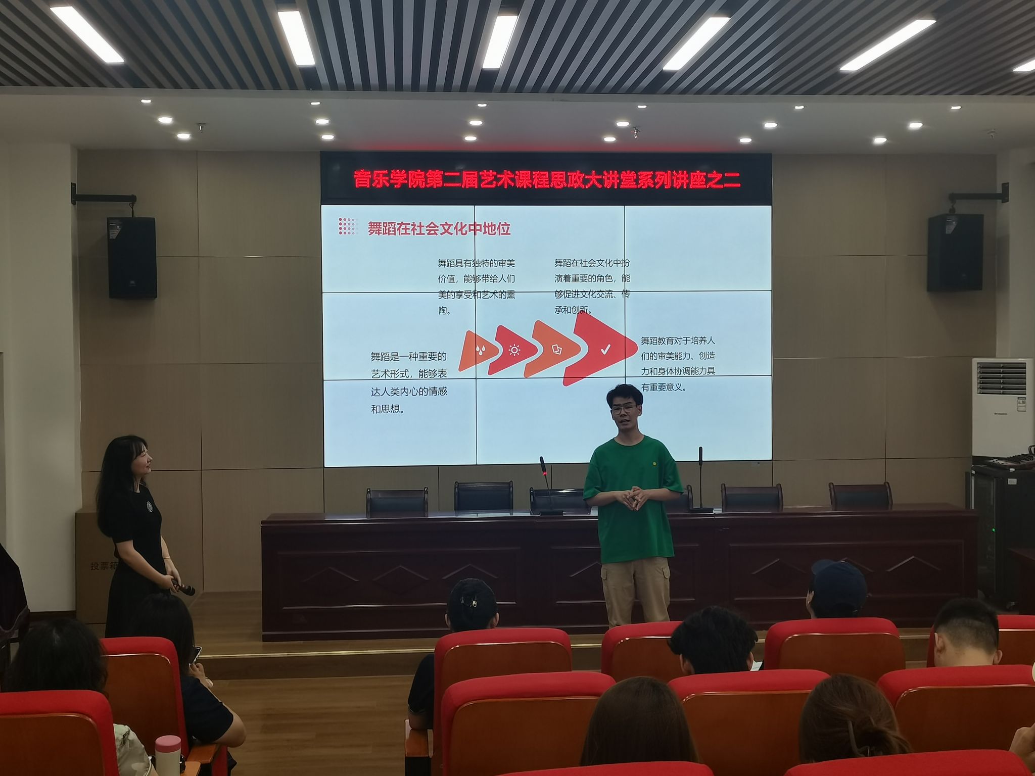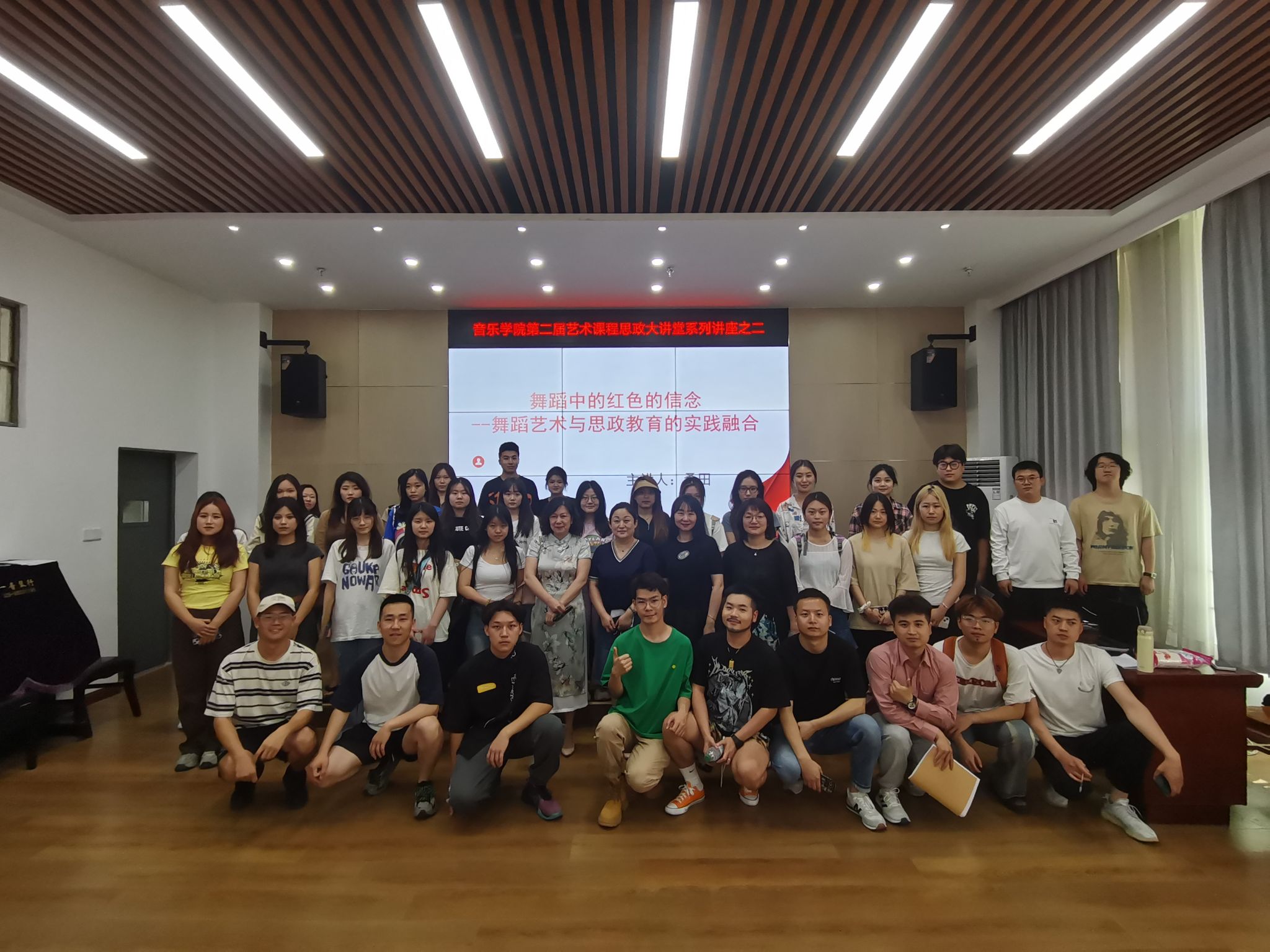 6月5日下午,音乐学院在明德楼C103报告厅举办桑田副教授主讲的第二届课程思政大讲堂系列讲座之二《舞蹈中的红色的信念——舞蹈艺术与思政教育的实践融合》,讲座由党总支委员高婧主持,学院领导、教师代表、学生党员参加讲座。